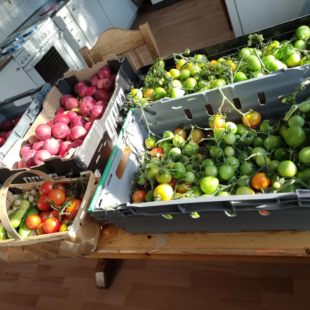 Vi har fruktträd och bärbuskar, odlar lite kryddor och en hel del grönsaker. Det bästa är att få skörda och laga mat av sin egen skörd. Sommaren 2021 blev det en fin äppelskörd, en hel del körsbärssaft, massor av tomater, de sista färska åt vi i mitten av november. Den sista squashen åt vi upp bara några dagar före jul och i frysen finns mangold, grönkål och inte minst flera kg tomatröra. I matkällaren finns på vintern bla äppelmos, krusbärsmarmelad, körsbärssaft och vinbärssaft av både röda och svarta vinbär.